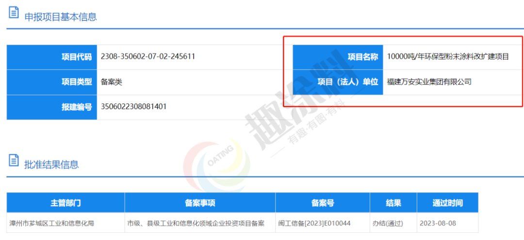 2023年8月8日,福建萬安實業(yè)集團有限公司,10000噸/年環(huán)保型粉末涂料改擴建項目,在漳州市薌城區(qū)工業(yè)和信息化局,進行市級、縣級工業(yè)和信息化領域企業(yè)投資項目備案。