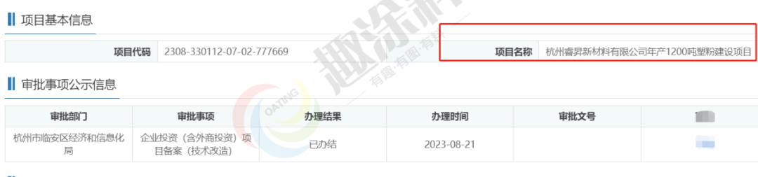 2023年8月21日,杭州睿昇新材料有限公司,年產1200噸塑粉建設項目,在杭州市臨安區(qū)經濟和信息化局,進行企業(yè)投資(含外商投資)項目備案(技術改造)。