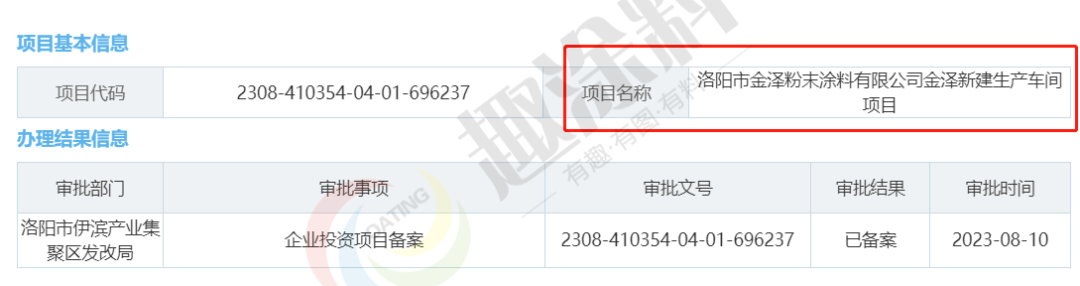 2023年8月10日,洛陽市金澤粉末涂料有限公司,新建生產車間項目,在洛陽市伊濱產業(yè)集聚區(qū)發(fā)改局,進行企業(yè)投資項目備案。