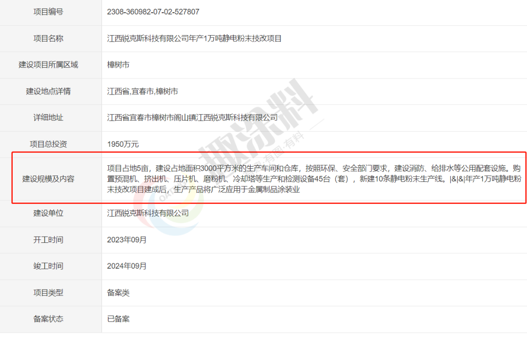 2023年8月17日,江西銳克斯科技有限公司,年產1萬噸靜電粉末技改項目,進行企業(yè)投資項目備案。