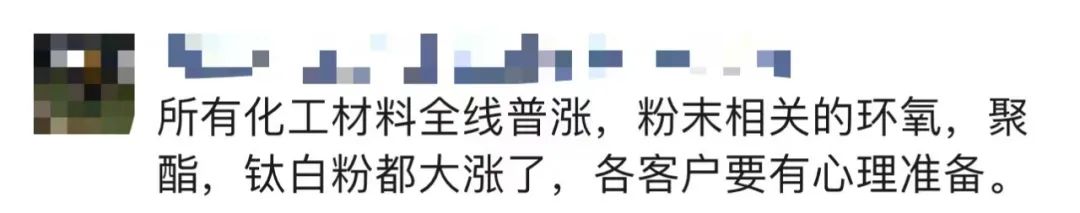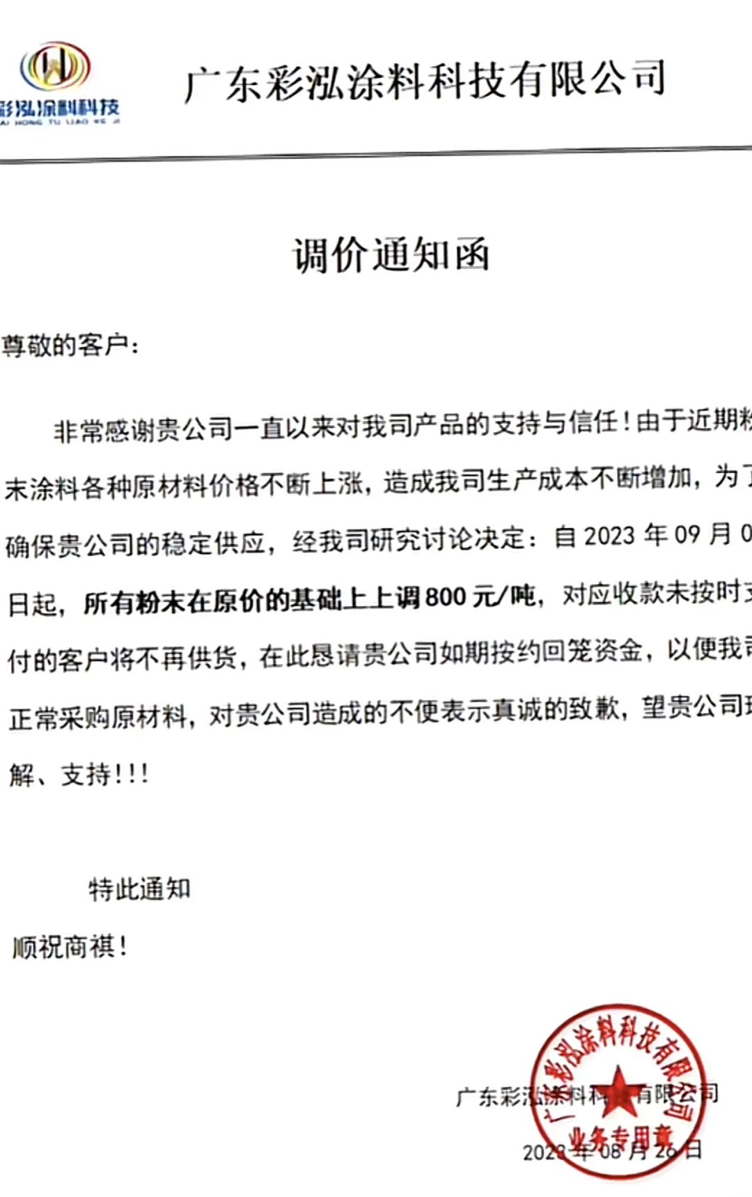 近日,廣東彩泓涂料科技有限公司對外發(fā)布漲價函稱,由于近期粉末涂料各種原材料價格不斷上漲,造成我司生產(chǎn)成本不斷增加,為確保貴公司的穩(wěn)定供應,經(jīng)我司研究討論決定:所有粉末在原價的基礎上上調800元/噸,對應收款未按時付的客戶將不再供貨,在此懇請貴公司如期按約回籠資金,以便我正常采購原材料。