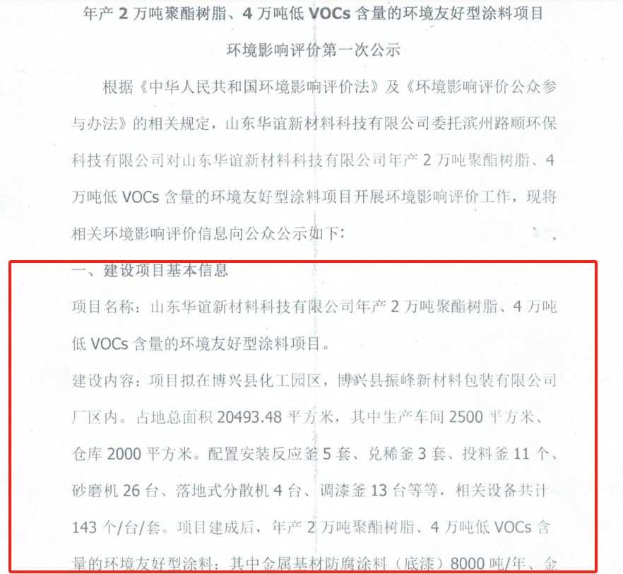 近日,山東華誼新材料科技有限公司年產(chǎn)2萬噸聚酯樹脂、4萬噸低VOCs含量的環(huán)境友好型涂料項目環(huán)境影響評價第一次公示。