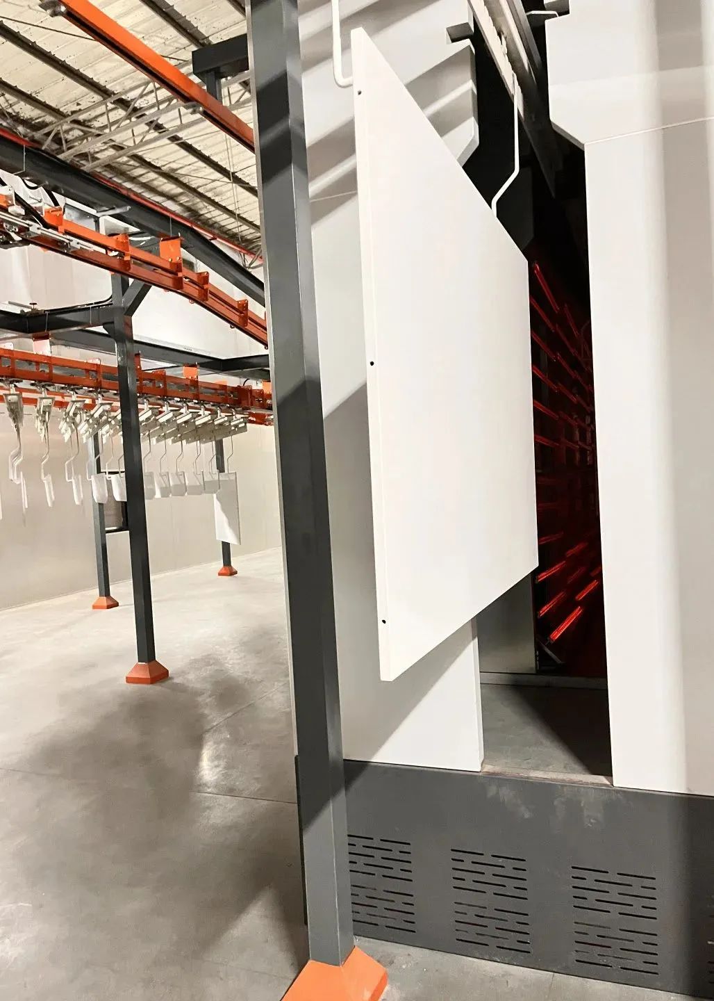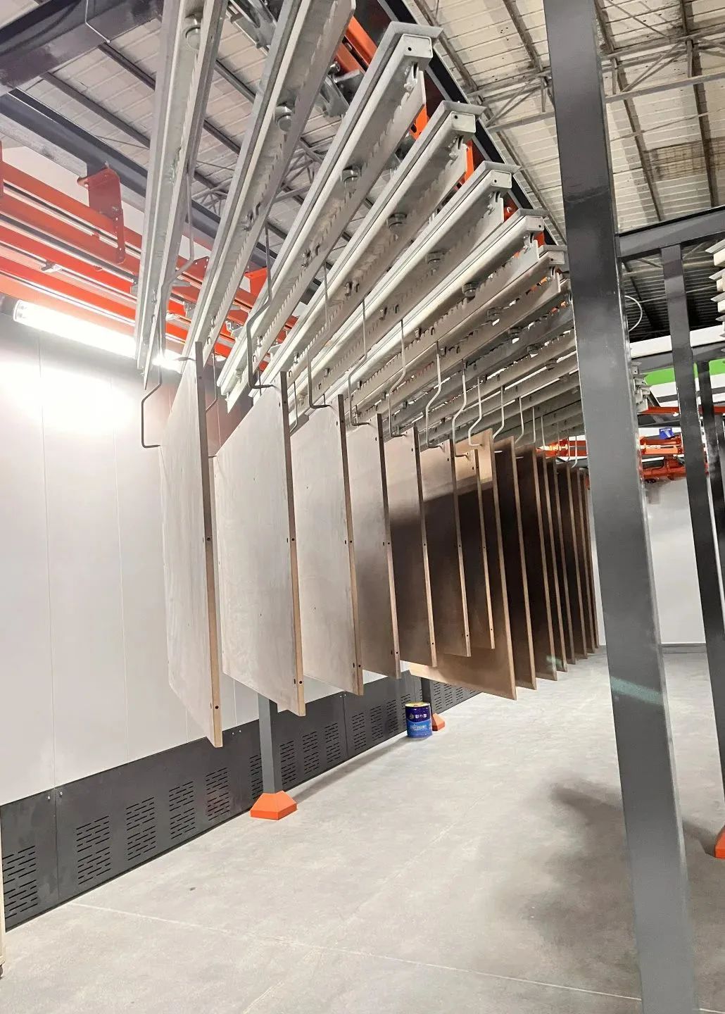 這條全新的MDF粉末噴涂生產(chǎn)線采用了數(shù)字固化系統(tǒng),可調(diào)式積放鏈系統(tǒng),雙粉房固化系統(tǒng),一體化集成系統(tǒng),魔術(shù)快速換色系統(tǒng),以及智能化冷卻系統(tǒng)。具有高效率、高精度、高穩(wěn)定性的特點(diǎn)。可同時(shí)噴至少兩種顏色,同步噴粉和同步固化,更柔性、效率更高,產(chǎn)能可實(shí)現(xiàn)1500平方/天。