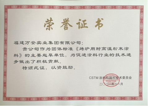 細(xì)分領(lǐng)域的開拓,不僅給福建萬安帶來了諸多成果,更為國內(nèi)高溫粉末涂料的發(fā)展提供了助推作用。福建萬安自2019年啟動耐高溫粉末涂料項目研究以來,共獲得新型高溫強耐候性粉末涂料新產(chǎn)品1項,國家授權(quán)發(fā)明專利3項,團體標(biāo)準(zhǔn)1項。其牽頭制定的中關(guān)村材料試驗技術(shù)聯(lián)盟(CSTM)團體標(biāo)準(zhǔn)T/CSTM 00640-2022《烤爐用耐高溫粉末涂料》也為福建萬安和行業(yè)發(fā)展提供了新的方案。