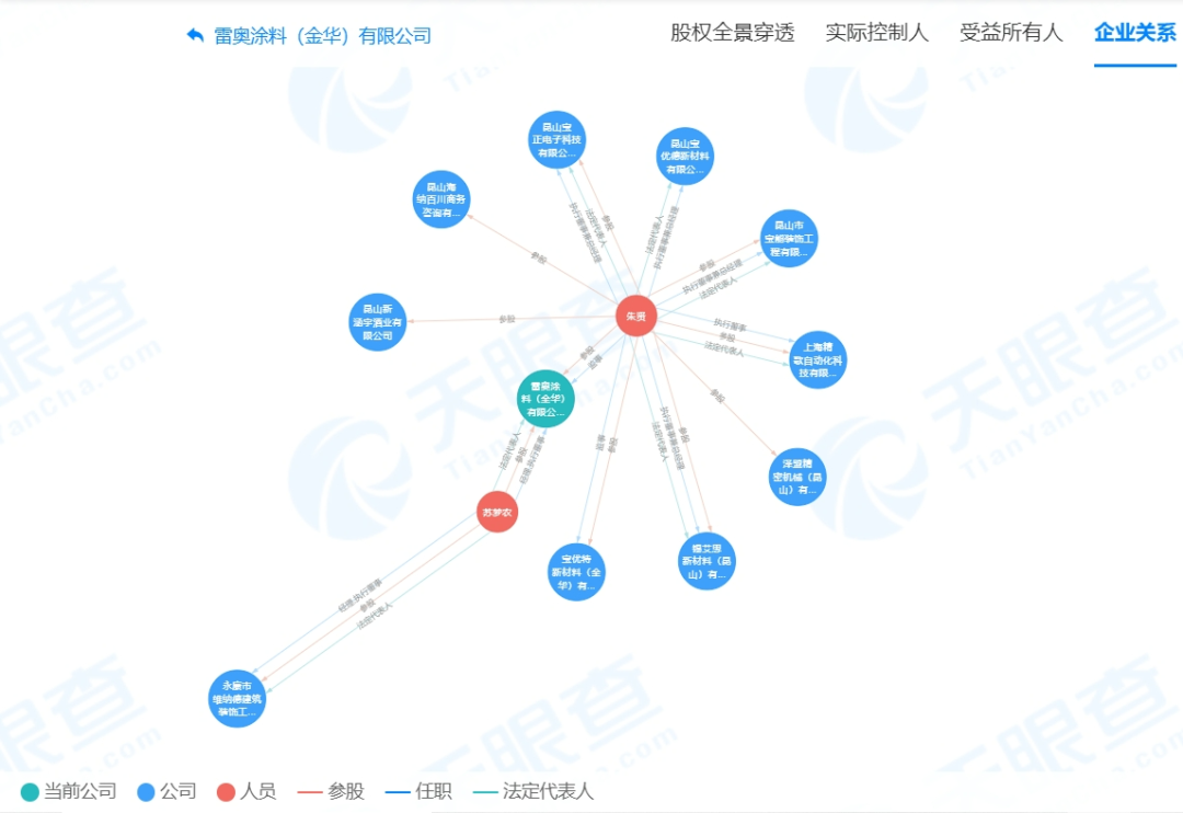 通過股權結(jié)構可以看到,雷奧涂料實際控股人為朱賢,占股90%;除了雷奧涂料,朱賢還控股了艾思新錫艾思新材料(昆山)有限公司(曾用名:昆山正光化工有限公司)、上海精歌自動化科技有限公司、昆山市寶能裝飾工程有限公司、寶優(yōu)特新材料(金華)有限公司等多家公司。