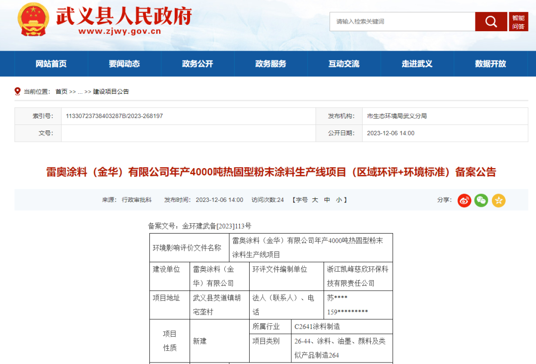2023年12月6日,浙江省金華市生態(tài)環(huán)境局武義分局對外發(fā)布《雷奧涂料(金華)有限公司年產(chǎn)4000噸熱固型粉末涂料生產(chǎn)線項目(區(qū)域環(huán)評+環(huán)境標準)備案公告》。