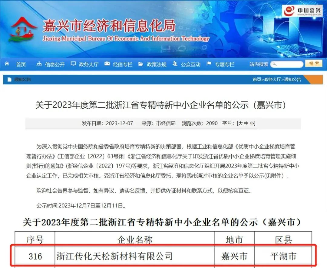 傳化化學(xué)下屬浙江傳化天松新材料有限公司(下稱“傳化天松新材料”)憑借其卓越的創(chuàng)新能力、強(qiáng)大的研發(fā)實(shí)力和專業(yè)水平,在激烈的競爭中脫穎而出,榮獲2023年度“浙江省專精特新中小企業(yè)”的認(rèn)定。