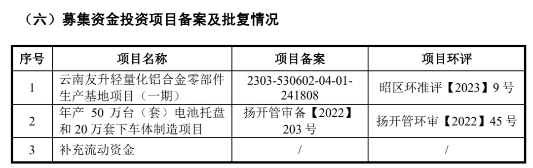 據(jù)悉,友升股份擬于上交所主板上市,保薦機(jī)構(gòu)為海通證券。公司計(jì)劃募資24.7億元,其中,12.7億元用于云南友升輕量化鋁合金零部件生產(chǎn)基地項(xiàng)目(一期),7億元用于年產(chǎn)50萬(wàn)臺(tái)(套)電池托盤和20萬(wàn)套下車體制造項(xiàng)目,5億元用于補(bǔ)充流動(dòng)資金。