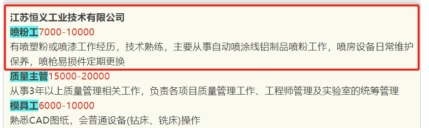 此前,江蘇恒義就曾就招聘噴粉工開出7000-10000元/月的工資價(jià)格。要求有噴塑粉或噴漆工作經(jīng)歷,技術(shù)熟練。日常工作內(nèi)容就是主要從事自動噴涂線鋁制品噴粉工作,噴房設(shè)備日常維護(hù)保養(yǎng),噴槍易損件定期更換。