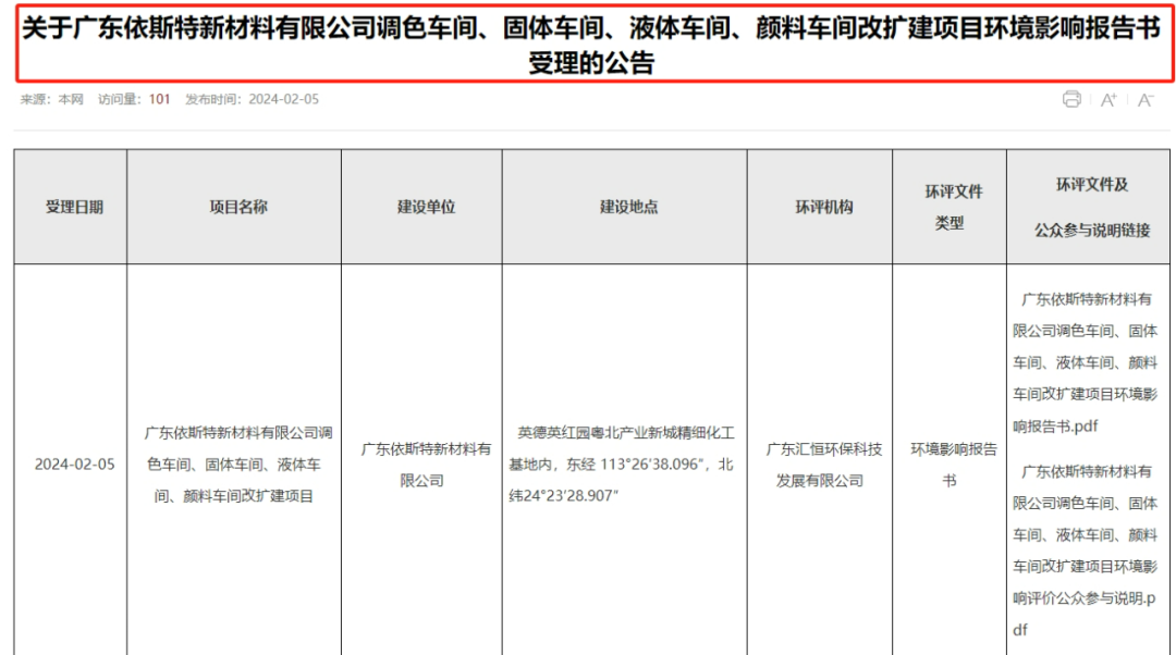 近日,清遠(yuǎn)市生態(tài)環(huán)境局對(duì)外發(fā)布《關(guān)于廣東依斯特新材料有限公司調(diào)色車(chē)間、固體車(chē)間、液體車(chē)間、顏料車(chē)間改擴(kuò)建項(xiàng)目環(huán)境影響報(bào)告書(shū)受理的公告》。