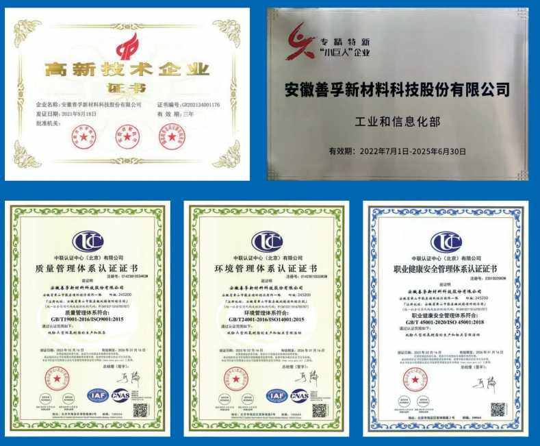 公司秉承“技術立企、以人為本”的發(fā)展理念,始終把技術作為企業(yè)發(fā)展的核心競爭力,長期與浙江大學、南京大學等院校密切合作,提升自主創(chuàng)新能力,實現可持續(xù)發(fā)展。公司連續(xù)三次被認定為“國家高新技術企業(yè)”,獲得國家級專精特新小巨人稱號,同時擁有一項安徽省科技進步一等獎,兩項安徽省科技進步三等獎,九項國家發(fā)明專利等?!吧奇凇笔瞧髽I(yè)的自主品牌,歷經三十載已發(fā)展成為國內粉末涂料原料行業(yè)的前三大品牌之一;“善孚”環(huán)氧樹脂被認定為安徽省名牌產品,“善孚”商標被認定為安徽省著名商標 。