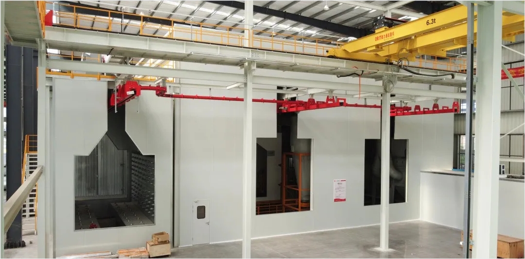 在環(huán)保低碳上,該生產(chǎn)系統(tǒng)采用的粉末涂裝工藝屬于無溶劑、零污染、低能耗、可回收的表面處理工藝方法,生產(chǎn)涂料利用率可達(dá)98%或以上,整體工作環(huán)境潔凈且對人體無害,符合國家“雙碳”戰(zhàn)略和企業(yè)綠色發(fā)展要求。
