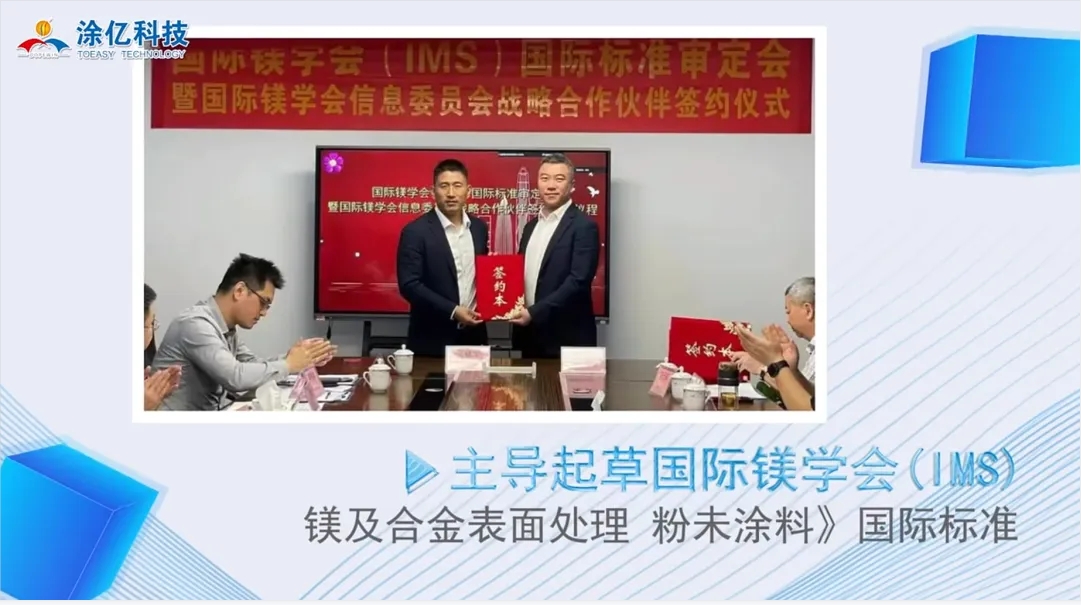 在積極推動國內(nèi)粉末涂料標準化的同時,涂億科技還積極參與國際標準的制定。在國際鎂學會(IMS)的平臺上,涂億科技主導起草了《鎂及合金表面處理 粉末涂料》國際標準。這一標準的制定,旨在為全球鎂及合金表面處理領(lǐng)域提供統(tǒng)一的技術(shù)規(guī)范和質(zhì)量要求,推動行業(yè)的技術(shù)進步和國際合作。通過參與國際標準的制定,涂億科技不僅展示了其在粉末涂料領(lǐng)域的領(lǐng)先地位,也為提升中國企業(yè)在全球舞臺上的影響力和話語權(quán)貢獻了自己的力量。