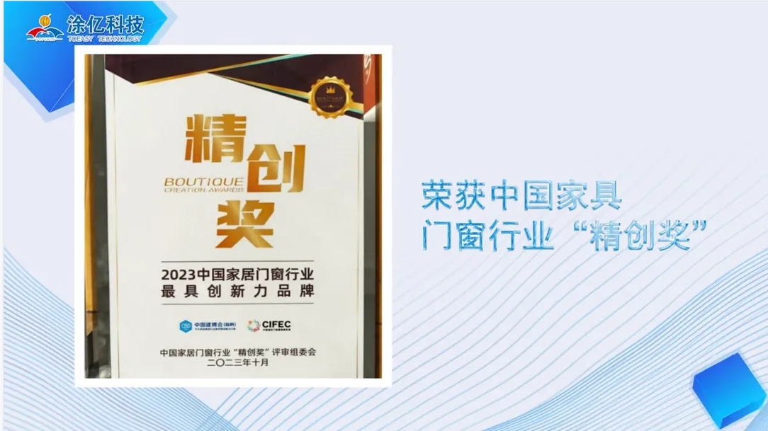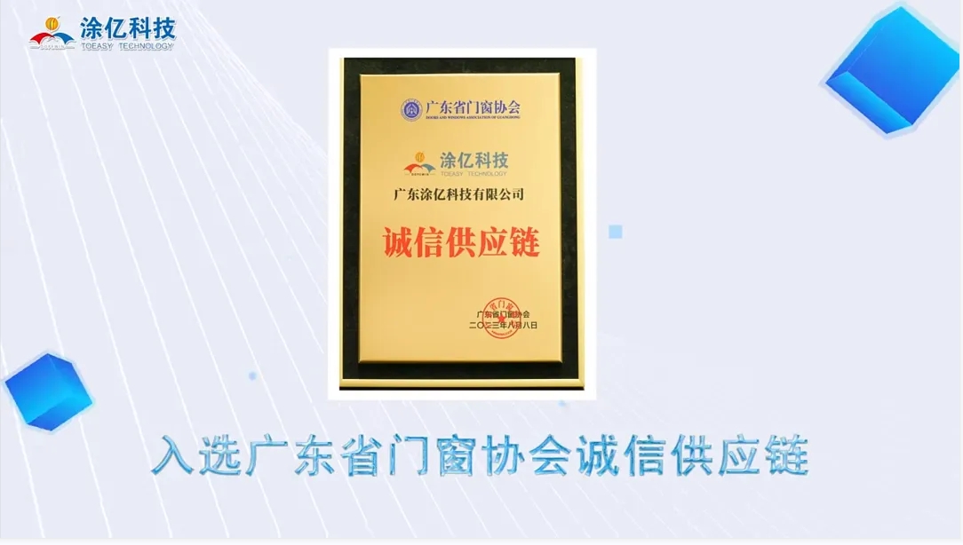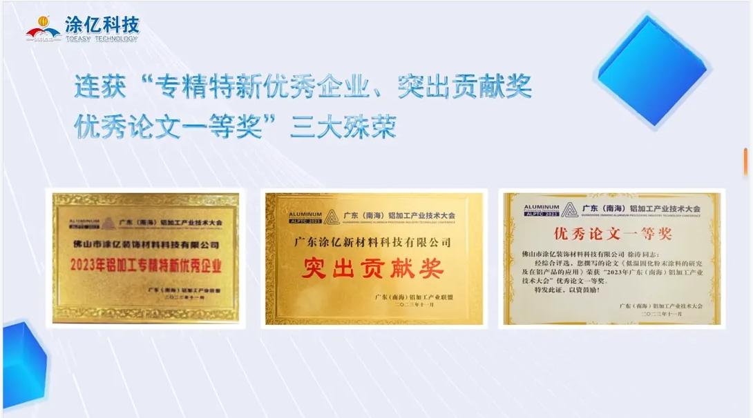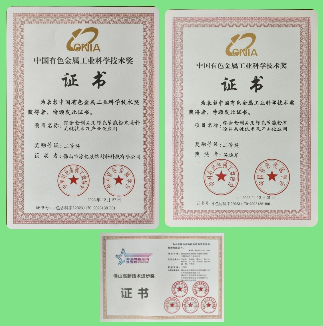 2023年,涂億科技以其卓越的表現(xiàn)和持續(xù)的努力,贏得了眾多榮譽和獎項,充分展現(xiàn)了其在粉末涂料行業(yè)的領(lǐng)先地位和強大的企業(yè)實力。公司入選廣東省門窗協(xié)會誠信供應鏈、榮獲中國家具門窗行業(yè)“精創(chuàng)獎”、連獲“專精特新優(yōu)秀企業(yè)、突出貢獻獎、優(yōu)秀論文一等獎”三大殊榮、獲得中國綠色產(chǎn)品認證,產(chǎn)品符合IATF16949:2016質(zhì)量管理體系標準認證,榮獲第五屆“佛山高新技術(shù)進步獎”二等獎和獲得中國有色金屬工業(yè)科學技術(shù)二等獎等等。