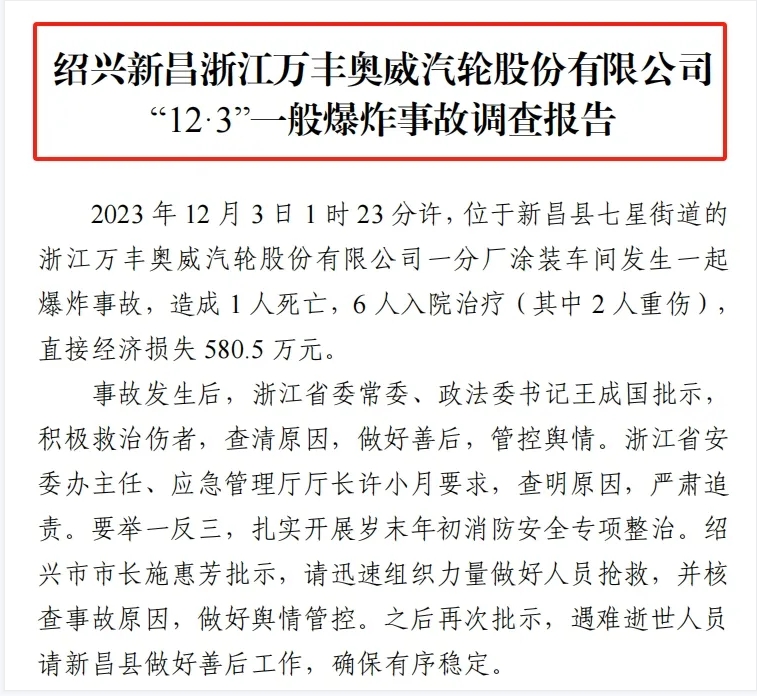 公告中指出,萬(wàn)豐奧威浙江新昌汽輪工廠第一工廠于2023年12月3日凌晨發(fā)生安全事故。近日,萬(wàn)豐奧威及相關(guān)人員分別收到新昌縣應(yīng)急管理局出具的《行政處罰決定書》。