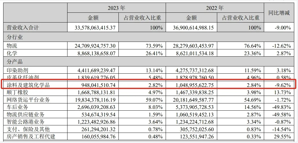 2024年4月23日,傳化智聯(lián)股份有限公司(下稱“傳化智聯(lián)”)對外發(fā)布《2023年年度報告》。報告顯示,2023年傳化智聯(lián)實現(xiàn)營業(yè)收入335.78億元,同比下滑9%;實現(xiàn)凈利潤5.91億元,同比下滑20.70%;實現(xiàn)扣非后凈利潤2.88億元,同比下滑38.43%。其中,涂料及建筑化學品業(yè)務實現(xiàn)營業(yè)收入9.48億元,同比增長2.82%。