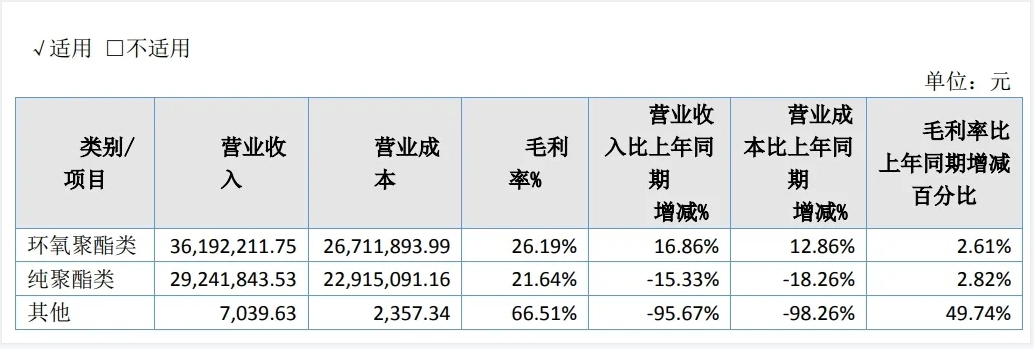具體產(chǎn)品來看,2023年飛揚科技在環(huán)氧聚酯類和純聚酯類產(chǎn)品的營業(yè)表現(xiàn)上呈現(xiàn)出截然不同的趨勢。環(huán)氧聚酯類產(chǎn)品憑借其出色的性能和廣泛的應用領域,在市場競爭中表現(xiàn)強勢,為公司帶來了顯著的營收增長。具體而言,環(huán)氧聚酯類產(chǎn)品在今年實現(xiàn)了營業(yè)收入3619.22萬元,同比增長16.86%,這一數(shù)字不僅彰顯了該類產(chǎn)品的市場競爭力,也反映了公司在產(chǎn)品研發(fā)和市場推廣上的努力成果。