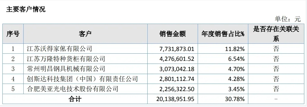 趣涂料(趣涂網(wǎng))注意到,飛揚科技2023年主要客戶為江蘇沃得家俬有限公司(銷售金額773.19萬元)、江蘇萬隆特種貨柜有限公司(銷售金額427.66萬元)、常州明昌鋼具機械有限公司(銷售金額307.3萬元)、創(chuàng)斯達科技集團(中國)有限責任公司(銷售金額280.11萬元)、合肥美亞光電技術股份有限公司(銷售金額225.63萬元)。