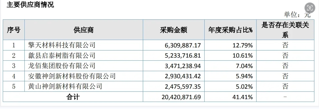 同期,公司主要供應商為擎天材料科技有限公司(采購金額630.99萬元)、歙縣啟泰樹脂有限公司(采購金額523.37萬元)、龍佰集團股份有限公司(347.12萬元)、安徽神劍新材料股份有限公司(采購金額293.04萬元)、黃山神劍新材料有限公司(采購金額247.56萬元)。