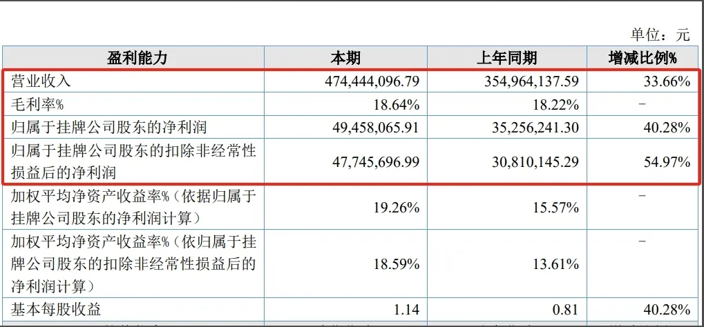 年報(bào)顯示,泰達(dá)新材2023年實(shí)現(xiàn)營業(yè)收入4.74億元,同比上升33.66%;營業(yè)成本3.86億元,同比增長32.97%;利潤總額5061.34萬元,同比增長38.32%;歸屬于母公司所有者的凈利潤4945.81萬元,同比增長40.28%。