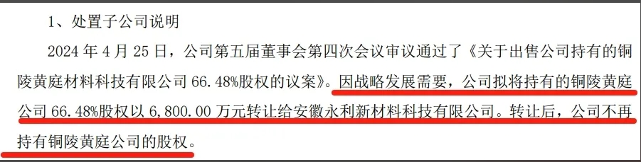 2024年4月25日,泰達(dá)新材第五屆董事會(huì)第四次會(huì)議審議通過了《關(guān)于出售公司持有的黃庭銅陵材料科技有限公司66.48%股權(quán)的議案》。因戰(zhàn)略發(fā)展需要,公司擬將持有的銅陵公司66.48%股權(quán)以6800萬元轉(zhuǎn)讓給安徽永利新材料科技有限公司。轉(zhuǎn)讓后,公司不再持有銅陵公司的股權(quán)。