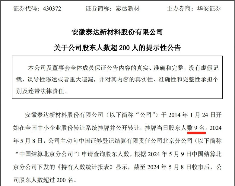 此外,泰達(dá)新材股東也大幅增加。同日,泰達(dá)新材對(duì)外發(fā)布《關(guān)于公司股東人數(shù)超200人的提示性公告》。公告中指出,泰達(dá)新材于2014年1月24日開始在全國中小企業(yè)股份轉(zhuǎn)讓系統(tǒng)掛牌并公開轉(zhuǎn)讓,掛牌當(dāng)日股東人數(shù)9名。不過,截至2024年5月8日收市后,公司股東人數(shù)超過200名。