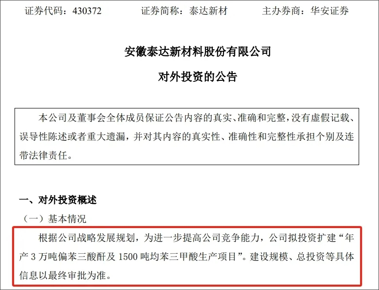 2023年5月8日,泰達(dá)新材對(duì)外發(fā)布《對(duì)外投資的公告》。公告中指出,根據(jù)公司戰(zhàn)略發(fā)展規(guī)劃,為進(jìn)一步提高公司競(jìng)爭能力,公司擬投資擴(kuò)建“年產(chǎn)3萬噸偏苯三酸酐及1500噸均苯三甲酸生產(chǎn)項(xiàng)目”。建設(shè)規(guī)模、總投資等具體信息以最終審批為準(zhǔn)。