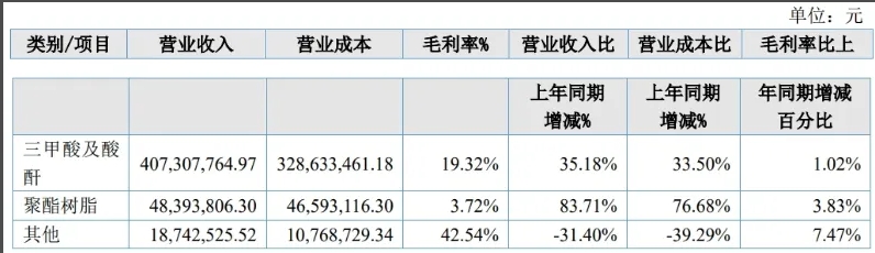 根據(jù)披露,泰達(dá)新材的營業(yè)收入主要來自于銷售三甲酸及酸酐產(chǎn)品。此外,由于泰達(dá)新材控股子公司黃庭銅陵材料科技有限公司(下稱“銅陵公司”)“年產(chǎn)12萬噸飽和聚酯樹脂項(xiàng)目”一期投入試生產(chǎn),2023年聚酯樹脂營業(yè)收入同比增長83.71%。