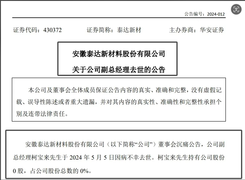 2024年5月7日,安徽泰達(dá)新材料股份有限公司(下稱“泰達(dá)新材”)對(duì)外發(fā)布《關(guān)于公司副總經(jīng)理去世的公告》。