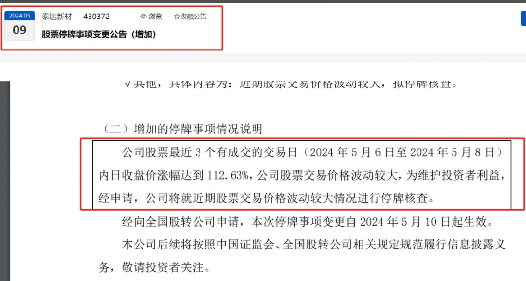 2024年5月9日,泰達(dá)新材對(duì)外發(fā)布《股票停牌事項(xiàng)變更公告(增加)》指出,公司股票最近3個(gè)有成交的交易日(2024年5月6日至2024年5月8日)內(nèi)日收盤價(jià)漲幅達(dá)到112.63%,公司股票交易價(jià)格波動(dòng)較大,為維護(hù)投資者利益,經(jīng)申請(qǐng),公司將就近期股票交易價(jià)格波動(dòng)較大情況進(jìn)行停牌核查。