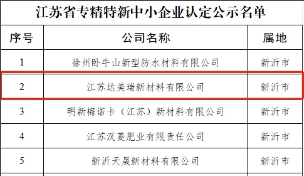 2023年12月,江蘇省工信廳公示了江蘇省2023年“專精特新”中小企業(yè)獲批名單,江蘇達美瑞新材料有限公司獲批省級“專精特新”企業(yè)。