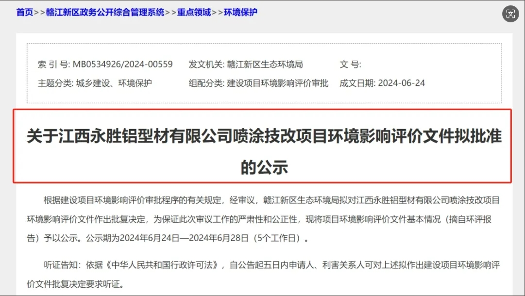 2024年6月24日, 贛江新區(qū)生態(tài)環(huán)境局對外發(fā)布《關(guān)于江西永勝鋁型材有限公司噴涂技改項(xiàng)目環(huán)境影響評(píng)價(jià)文件擬批準(zhǔn)的公示》。