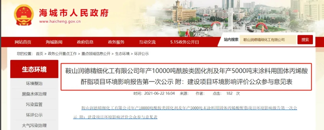 趣涂料(趣涂網(wǎng))注意到,早在2021年6月,海城市官網(wǎng)就對外發(fā)布了《鞍山潤德精細(xì)化工有限公司年產(chǎn)10000噸酰胺類固化劑及年產(chǎn)5000噸末涂料用固體丙烯酸酐脂項目環(huán)境影響報告第一次公示》。