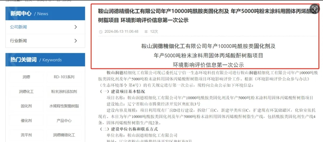 近日,鞍山潤德精細(xì)化工有限公司(下稱“鞍山潤德”)在其官網(wǎng)上對外發(fā)布《公司年產(chǎn)10000噸酰胺類固化劑及年產(chǎn)5000噸粉末涂料用固體丙烯酸酐樹脂項目環(huán)境影響評價信息第一次公示》。