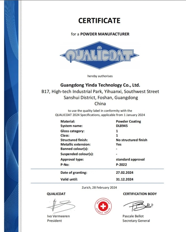 對于銀大科技而言,2024年是機遇之年,更是崛起之年。今年3月份,銀大科技的產(chǎn)品DL8945順利通過QUALICOAT一類粉認證,認證編號為P-2022。展望未來,銀大科技表示,將以優(yōu)質(zhì)的產(chǎn)品,快速的服務(wù),本著“共創(chuàng)、共贏、共享”的發(fā)展理念,與客戶攜手并進,共同發(fā)展。
