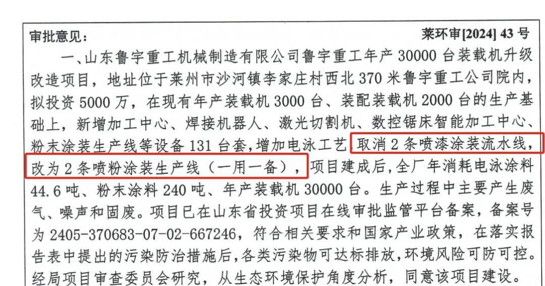根據(jù)披露,該項目地址位于萊州市沙河鎮(zhèn)李家莊村西北370米魯宇重工公司院內(nèi),擬投資5000萬,在現(xiàn)有年產(chǎn)裝載機3000臺、裝配裝載機2000臺的生產(chǎn)基礎上,新增加工中心、焊接機器人、激光切割機、數(shù)控鋸床智能加工中心、粉末涂裝生產(chǎn)線等設備 131臺套,增加電泳工藝,取消2條噴漆涂裝流水線,改為2條噴粉涂裝生產(chǎn)線(一用一備)。項目建成后,全廠年消耗電泳涂料44.6噸、粉末涂料240噸、年產(chǎn)裝載機30000臺。