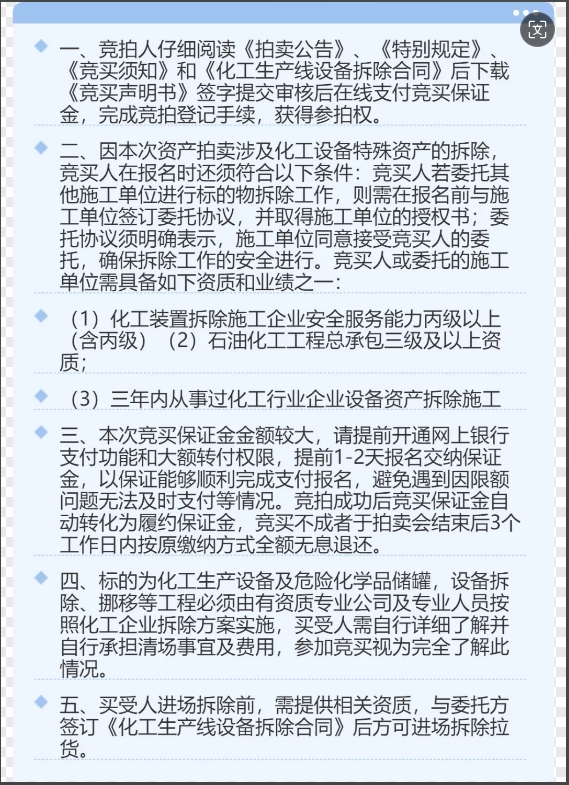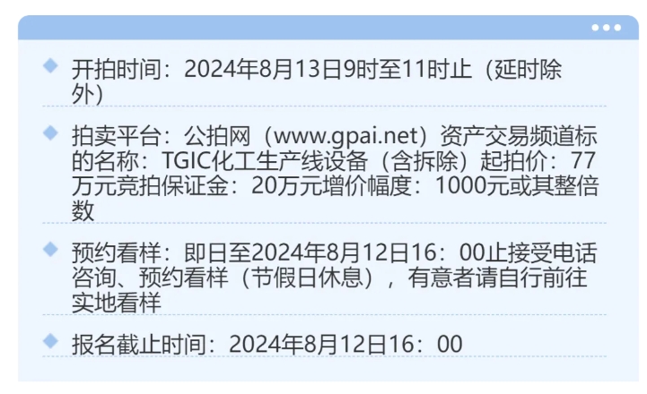 趣涂料(趣涂網(wǎng))注意到,近日,公拍網(wǎng)上有TGIC化工生產(chǎn)線設(shè)備(含拆除)在拍賣,起拍價(jià)77萬(wàn)元,保證金20萬(wàn)元。根據(jù)披露,拍賣標(biāo)的坐落于安徽黃山市歙縣循環(huán)經(jīng)濟(jì)園。