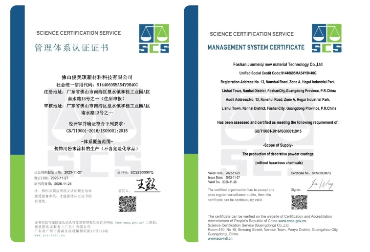 質(zhì)量認(rèn)證,讓消費更安全、更優(yōu)質(zhì),在今年,俊美琪順利通過了國家GB/T19001-2016/ISO9001:2015體系認(rèn)證,獲得質(zhì)量管理體系認(rèn)證證書,認(rèn)證所覆蓋的范圍為:裝飾用粉末涂料的生產(chǎn)(不含危險化學(xué)品),再次彰顯品質(zhì)力量!