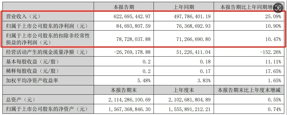 半年報中指出,高盟新材今年上半年實現(xiàn)營業(yè)收入6.23億元,同比增加1.25億元,增幅為25.09%;實現(xiàn)凈利潤8469.38萬元,同比增加832.51萬元,增幅為10.90%;實現(xiàn)扣非后凈利潤7872.8萬元,同比增長10.47%。