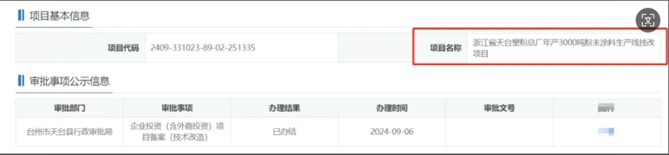 2024年9月6日,浙江省天臺塑粉總廠(下稱“天臺塑粉”),年產(chǎn)3000噸粉末涂料生產(chǎn)線技改項目,在臺州市天臺縣行政審批局,進行企業(yè)投資(含外商投資)項目備案(技術(shù)改造)。