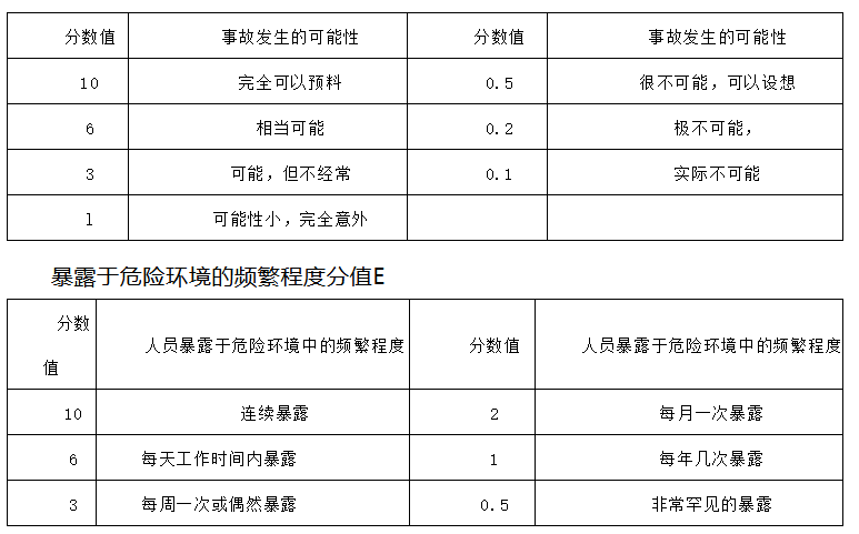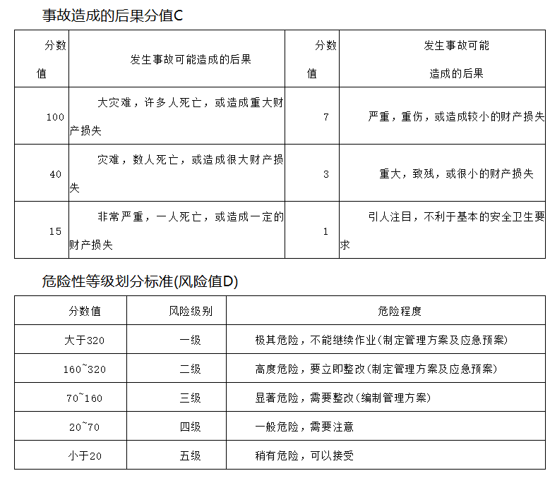 作業(yè)條件的危險(xiǎn)性評(píng)價(jià)法以類(lèi)比作業(yè)條件進(jìn)行比較為基礎(chǔ),由熟悉類(lèi)比作業(yè)條件的專(zhuān)家按規(guī)定標(biāo)準(zhǔn)給L、E、C分別打分,計(jì)算出危險(xiǎn)性分值D來(lái)評(píng)價(jià)作業(yè)條件的危險(xiǎn)性等級(jí)。
