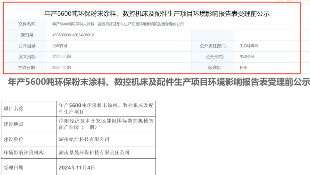 根據(jù)披露,湖南銘浩科技有限公司在邵陽(yáng)經(jīng)濟(jì)技術(shù)開發(fā)區(qū)自建廠房建設(shè)年產(chǎn)5600噸環(huán)保粉末涂料、數(shù)控機(jī)床及配件生產(chǎn)項(xiàng)目,項(xiàng)目總占地面積6849.47m2,項(xiàng)目主體工程為年產(chǎn)5600噸粉末涂料、數(shù)控機(jī)床及配件生產(chǎn)線,同時(shí)配套輔助工程、環(huán)保工程、公用工程。