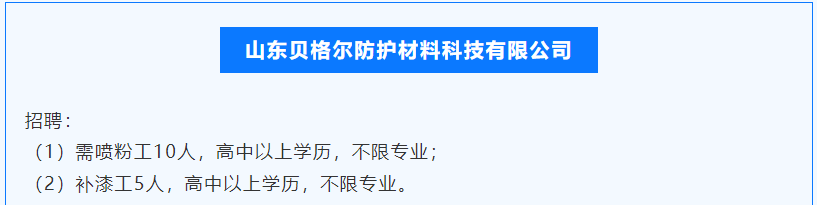 受益于客戶市場(chǎng)增長(zhǎng)需求,貝格爾近日發(fā)出招聘公告,需噴粉工10人,高中以上學(xué)歷,不限專業(yè)。具體地址為梁山縣拳鋪鎮(zhèn)通亞路東首路南。