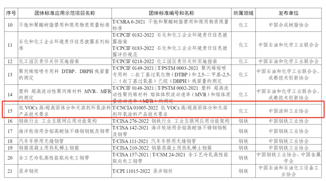 2023年12月6日工信部發(fā)布了《關于公布2023年團體標準應用示范項目的通告》。其中,T/CNCIA 01005-2022《低VOCs高/超高固體分和無溶劑環(huán)氧涂料產品技術要求》成功入選團體標準應用示范項目。