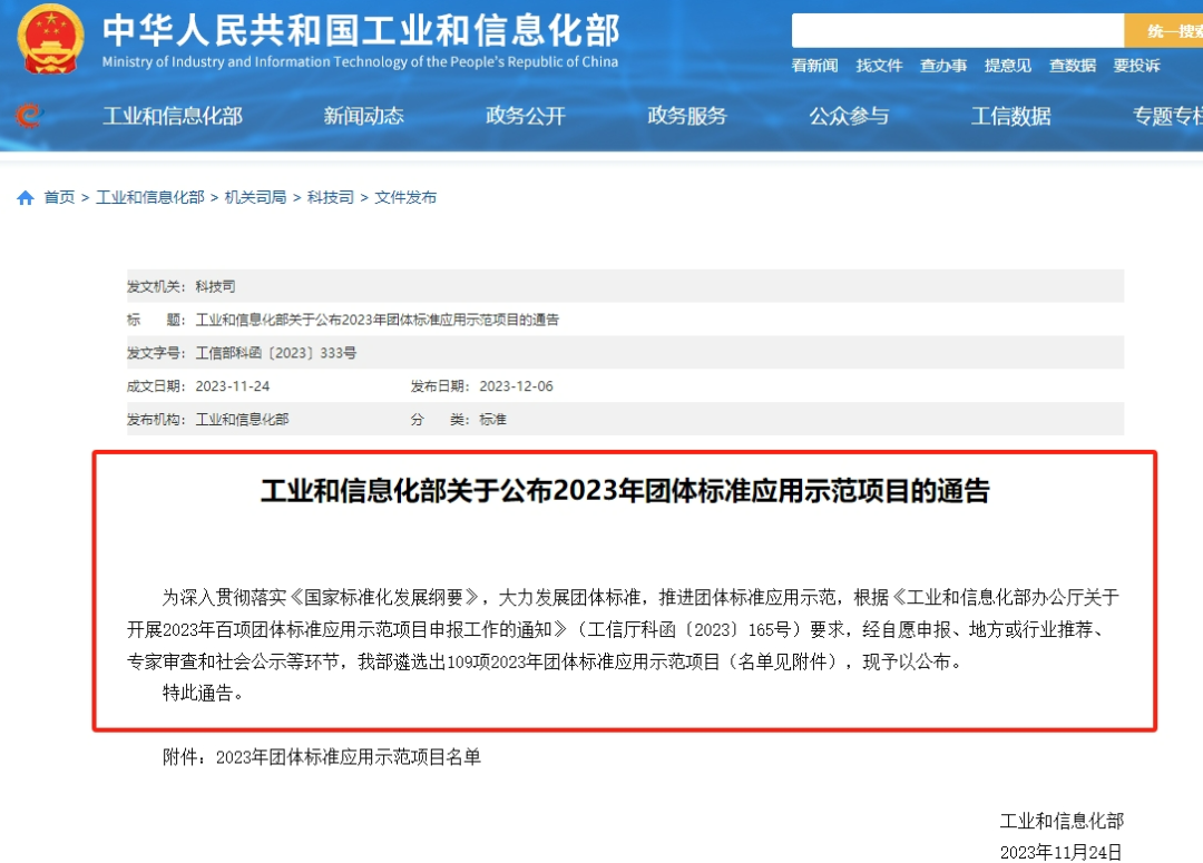 為深入貫徹落實《國家標準化發(fā)展綱要》,大力發(fā)展團體標準,推進團體標準應用示范,根據《工業(yè)和信息化部辦公廳關于開展2023年百項團體標準應用示范項目申報工作的通知》(工信廳科函〔2023〕165號)要求,工信部開展了2023年團體標準應用示范項目的遴選工作。
